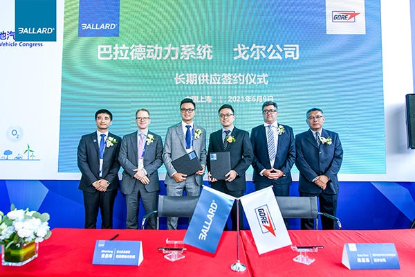 中国、上海(2021年6月9日) — 本日、バラード・パワー・システムズ社(以下、バラード)とW. L. Gore & Associates(以下、ゴア)が複数年の燃料電池供給契約の締結を発表しました。第6回国際水素燃料電池自動車会議(FCVC 2021)にて行われた署名式では、両社のこれまでの協力関係や供給パートナーシップを称えるとともに、燃料電池技術のメリットと用途をさらに発展させるための新たな取り組みを記念するものとなりました。両社は世界規模での各種アプリケーションにこの燃料電池技術を発展させることに意欲を示しました。