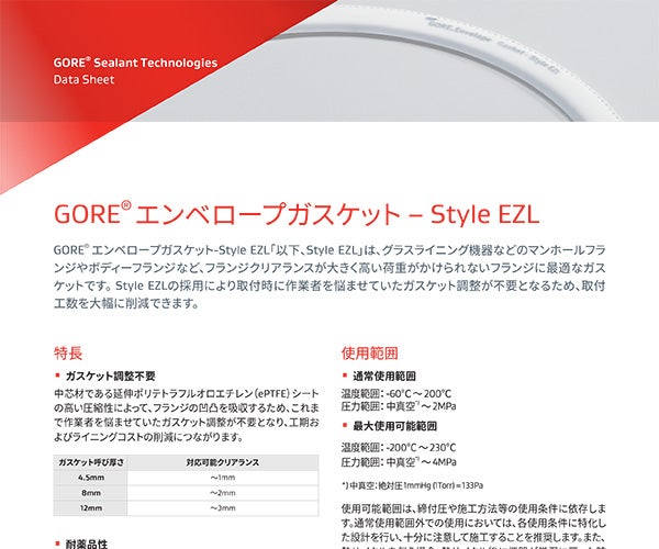 ゴア® エンベロープガスケット‐ Style EZL® は樹脂フランジおよびグラス・樹脂ライニング フランジなどに使用可能な高性能低締付圧ガスケットです。