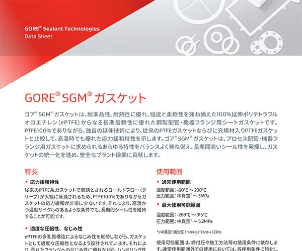 ゴアのシーラント製品には、シートガスケット、カットガスケット、ジョイントシーラントガスケットテープなどがあります。 鋼製配管・機器フランジ、FRPフランジなどのさまざまな産業設備の封止で使用されるゴアのシーラント製品は、設置が簡単で、クリープやコールドフローへの耐性を備えています。 各製品は100%ePTFE製であるため、化学的に不活性で、溶融アルカリ金属と高温・高圧のフッ素を除くほとんどすべての化学薬品への耐性を備えます。